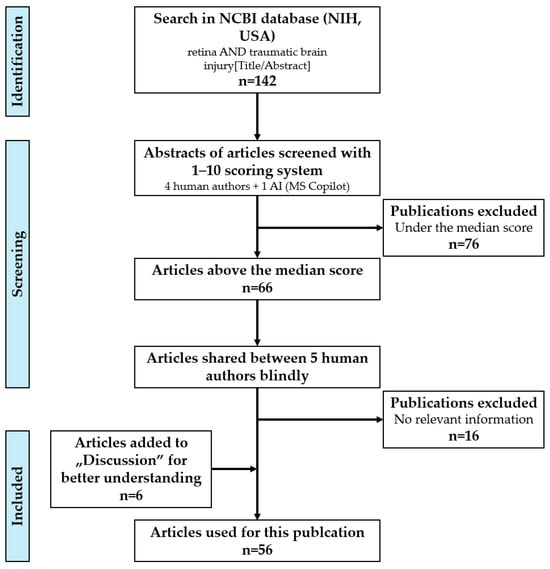 To identify articles relevant to this review, we first used the following search terms in the NCBI database (NIH, USA): (retina AND (traumatic brain injury [Title/Abstract]). Based on this, we obtained 142 articles in the first round of search. Following this, we used a 1–10 scoring system (1–3: non-relevant, 4–6: fair relevance, 7–9: very relevant, and 10: perfect match to the topic) on the titles and abstracts. Four authors independently scored all articles based on the titles and abstracts. We used Copilot (Microsoft) as a fifth scorer. The AI model was limited to testing only 13–15 articles after testing scoring reliability based on divergence (error rate > 4 human mean error) from the human scores; therefore, we introduced all articles in 12 packages. This resulted in an acceptable score with low divergence from the human mean. The average scores (4 humans and 1 AI) of 66 searched papers were above the median score. We included these in our detailed reading and analysis. These articles were equally shared between 5 human authors (AI was only used for scoring) after blind selection, and the relevant information was added to the pre-defined paragraphs in an ad hoc manner. Subsequently, correct phrasing, information linking, and writing were carried out by all authors on a shared Google Drive platform. Additionally, 6 other articles were included in the Discussion to aid the understanding of recent developments and how these can come together to aid the translation of our findings from the literature search (see the detailed process in a flowchart in Figure 1).