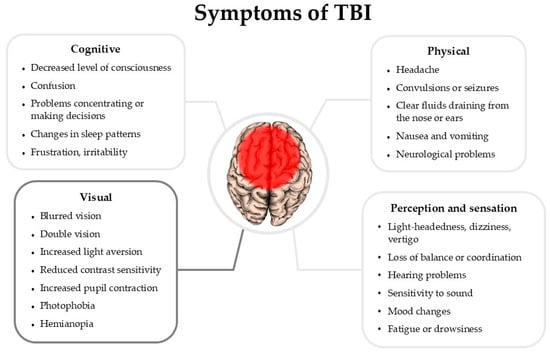 Symptoms of TBI in patients are described based on related references in this review article. The list of symptoms is based on NIH health information data [,,,,].