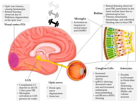 The retina, as part of the CNS, is particularly susceptible to damage, including that induced by TBI (Figure 3). The literature describes different TBI types and models. For clarification, we describe the models or types of TBI if needed, as they can have minor but important differences in their effects on the visual system.