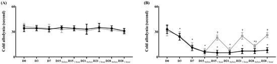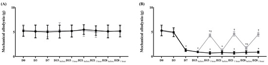 ) treatment group. Data are presented as means ± standard deviation (n = 6 per group). Statistical significance was determined by two-way repeated analysis of variance (ANOVA) followed by Tukey’s post hoc test for intra-group comparisons and unpaired t-test for inter-group comparisons. Abbreviations: Control, control group; treatment, treatment group; D0, before the surgery; D, day after the surgery; before, before the treatment of normal saline or pregabalin; after, 60 min after the treatment of normal saline or pregabalin. * p < 0.05 compared with D0 within the same group. † p < 0.05 compared with the control group at the same time point.