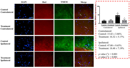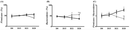 ) treatment group. Data are presented as means ± standard deviation (n = 6 per group). Statistical significance was determined by two-way repeated ANOVA (followed by Tukey’s post hoc test for within-group comparisons over time and for between-group comparisons at specific time points). Abbreviations: D0, before the surgery; D, day after the surgery. * p < 0.05 compared with D0 within the same group. † p < 0.05 compared with D15 within the same group. ‡ p < 0.05 compared with the control group at the same time point.