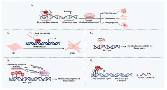 EBF1 plays a direct role in breast cancer (BC) progression by modulating tumor metabolism-related pathways. Qiu et al. reported that EBF1 is significantly overexpressed in triple-negative breast cancer (TNBC) and suppresses the co-activator function of histone acetyltransferase p300 by forming a complex with p300 and HIF1α []. This EBF1-p300-HIF1α complex inhibits HIF1α transcriptional activity, thereby impeding the full activation of its downstream target genes. This process helps maintain mitochondrial homeostasis in TNBC cells, inhibits cell death caused by excessive mitochondrial autophagy, and promotes TNBC cell proliferation, migration, and disease progression. Notably, the study also revealed that HIF1α can positively regulate EBF1 promoter activity, thereby upregulating EBF1 expression and establishing a positive feedback loop that reinforces the malignant phenotype of TNBC. Beyond its role in tumor cell metabolism, EBF1 also contributes to remodeling the tumor microenvironment (TME), particularly through the activation of cancer-associated fibroblasts (CAFs)—key stromal components whose increased presence is closely linked to BC progression, invasion, and metastasis. One study demonstrated that EBF1 is a critical mediator in the upregulation of FAM171A1 expression by the lncRNA SNHG14 []. Specifically, SNHG14 directly binds to the EBF1 protein and promotes transcription of the FAM171A1 gene by recruiting or stabilizing EBF1. This SNHG14/EBF1/FAM171A1 signaling axis has been shown to transform normal fibroblasts (NFs) into pro-tumorigenic CAFs, thereby fostering a microenvironment that supports tumor growth and metastasis.