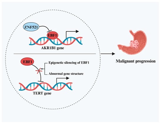 EBF1 exerts its anti-cancer effects in gastric cancer (GC) primarily by transcriptionally repressing key oncogenes. Cheng et al. [] demonstrated that EBF1 directly binds to and downregulates the expression of aldo-keto reductase family 1 member B1 (AKR1B1), thereby inhibiting GC cell proliferation, migration, and invasion. However, the study also revealed that elevated levels of another transcription factor, zinc finger protein 521 (ZNF521), in tumor tissues could indirectly promote AKR1B1 expression by suppressing EBF1. This regulatory axis diminishes the tumor-suppressive activity of EBF1 and facilitates cancer progression, highlighting the complexity of upstream modulation within the EBF1-associated anti-tumor network. In addition to targeting AKR1B1, EBF1 also influences tumor progression by interfering with telomerase activity. Reactivation of the telomerase catalytic subunit (TERT) is a critical mechanism by which cancer cells bypass senescence and attain unlimited proliferative capacity, a hallmark of many malignancies. EBF1 has been identified as a direct transcriptional repressor of TERT []. Loss of EBF1 function or reduced expression is considered a key contributor to the aberrant upregulation of TERT in GC. This dysregulation arises through multiple mechanisms, primarily including epigenetic silencing and structural abnormalities of the gene. Epigenetic silencing involves hypermethylation of the EBF1 promoter and repressive histone modifications. Structural alterations may include mutations within the EBF1 DNA-binding domain or deletions and rearrangements near the TERT regulatory region, hindering EBF1’s ability to bind the TERT promoter. These events collectively diminish EBF1-mediated repression of TERT, resulting in enhanced telomerase activation and genomic instability, driving sustained proliferation and malignant progression of GC cells. In summary, EBF1 exerts potent tumor-suppressive effects in GC by targeting both AKR1B1 and TERT (Figure 2), and restoring EBF1 expression represents a promising strategy for targeted therapy.