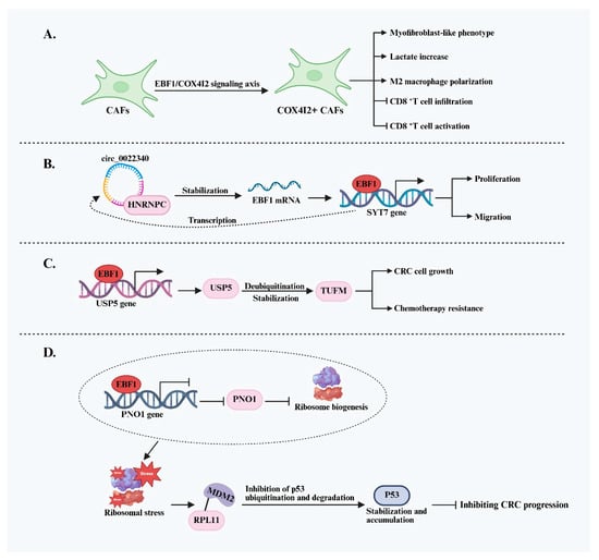 Summary of the oncogenic and tumor-suppressive mechanisms of EBF1 in CRC. (A) EBF1 promotes metabolic reprogramming and immune suppression by activating COX4I2+ CAFs, thereby establishing an immune-evasive microenvironment and reducing the responsiveness of CRC to immunotherapy. (B) circ_0022340 enhances the stability of EBF1 mRNA through HNRNPC, leading to transcriptional activation of SYT7 and driving CRC cell proliferation and migration. (C) EBF1 upregulates USP5 expression to stabilize TUFM protein, promoting CRC cell growth and enhancing chemoresistance. (D) EBF1 suppresses PNO1 expression to induce ribosomal stress, thereby activating the p53 signaling pathway and exerting a tumor-suppressive effect in CRC.
