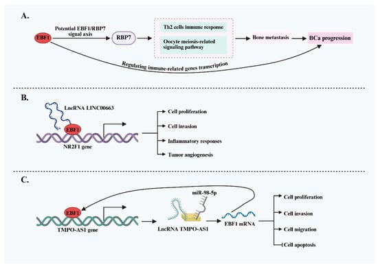 EBF1-mediated oncogenic mechanisms and regulatory network in BCa. (A) EBF1 may promote BCa invasiveness and bone metastasis by activating RBP7 and immune-related pathways, suggesting a potential role in malignant progression. (B) LINC00663 upregulates EBF1, which subsequently activates NR2F1 expression, promoting proliferation, invasion, inflammatory response, and angiogenesis in BCa cells. (C) EBF1 activates the oncogenic lncRNA TMPO-AS1 and forms a positive feedback loop via miR-98-5p, thereby enhancing proliferation, migration, and invasion of BCa cells while inhibiting apoptosis.