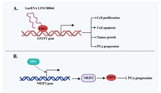 In contrast to its pro-oncogenic roles in certain malignancies, existing studies suggest that EBF1 functions predominantly as a tumor suppressor in prostate cancer (PCa) (Figure 5). A key study by Qiu et al. [] elucidated the molecular mechanism through which EBF1 inhibits PCa progression. The authors identified lncRNA LINC00844 as a crucial mediator in this process. LINC00844 recruits EBF1 to the promoter region of glutathione S-transferase P1 (GSTP1), enhancing its transcription. GSTP1 is a well-established tumor suppressor, and its upregulation leads to reduced PCa cell proliferation and increased apoptosis, effectively impeding disease progression. Notably, the anti-cancer effect of LINC00844 was abolished upon EBF1 silencing, confirming that its tumor-suppressive function is strictly EBF1-dependent. In addition to lncRNA-mediated regulation, EBF1 expression is also modulated by other signaling pathways. Further research by Shao et al. [] explored EBF1’s role in drug response. Treatment of PCa cells with dihydroartemisinin (DHA), an anti-tumor compound, significantly increased the expression of NR2F2, a transcription factor that directly binds to the EBF1 promoter and activates its transcription. Rescue experiments demonstrated that NR2F2 knockdown reversed the DHA-induced upregulation of EBF1, suggesting that EBF1 functions as a downstream effector of NR2F2. Although the independent anti-cancer role of EBF1 was not explicitly dissected in this study, its involvement in the NR2F2 regulatory network indirectly supports its tumor-suppressive role in PCa.