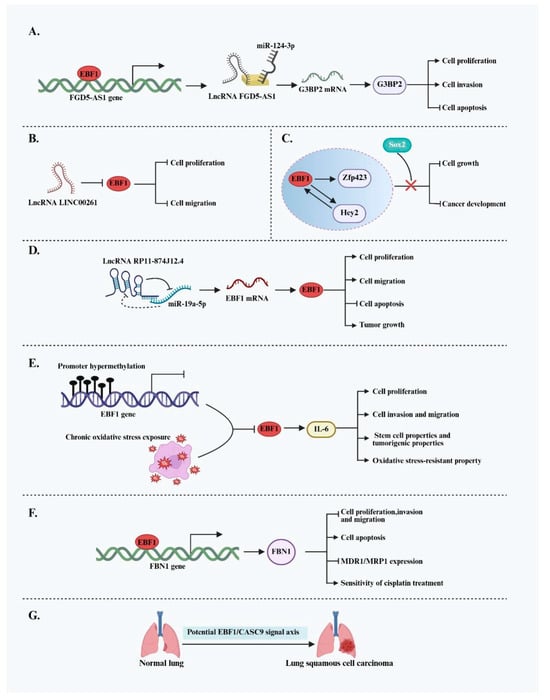 Beyond the previously discussed cancers, the role of EBF1 in other solid tumors is gradually being uncovered, although its function exhibits considerable heterogeneity. In several malignancies, EBF1 displays apparent pro-oncogenic activity. For instance, EBF1 promotes tumor progression in osteosarcoma by regulating non-coding RNA networks. Specifically, EBF1 transcriptionally activates the lncRNA FGD5-AS1, which functions as a ceRNA by sponging miR-124-3p. This interaction relieves miR-124-3p-mediated suppression of G3BP2, leading to increased G3BP2 protein levels []. Upregulated G3BP2 enhances osteosarcoma cell proliferation and invasion while inhibiting apoptosis. In thyroid cancer (TC), EBF1 has been identified as a significantly upregulated oncogene. Knockdown of the tumor-suppressive lncRNA LINC00261 promotes TC cell proliferation and migration; however, this effect is reversed when EBF1 is concurrently silenced, indicating that EBF1 is a key mediator of the oncogenic pathway downstream of LINC00261 []. Oral squamous cell carcinoma (OSCC) is a common cancer worldwide, with recurrence and metastasis posing serious threats to patient outcomes. In OSCC, EBF1 also plays an oncogenic role, with its expression regulated by upstream lncRNAs. Specifically, the oncogenic lncRNA RP11-874J12.4, which is aberrantly overexpressed in OSCC, directly binds to and suppresses miR-19a-5p, forming a negative regulatory loop. The resulting downregulation of miR-19a-5p leads to increased expression of its target gene, EBF1. Elevated EBF1 expression subsequently promotes OSCC cell proliferation, migration, and in vivo tumor growth []. This study not only reveals a novel regulatory mechanism underlying OSCC tumorigenesis but also suggests a potential new target for OSCC diagnosis and therapy.
