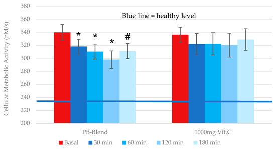 Time-dependent CMA values after oral single-dose administration of 50 mg of PB-Blend or 1000 mg of Vitamin C in subjects recovering from COVID-19 infection. CMA (generation of ROS) was determined in human whole-blood samples using NOXYSCAN EPR system, and partially in parallel with the portable VitaScreen electron spin resonance analyzer, 18–24 days after the diagnosis of COVID-19. The CMA values were highly elevated in the PB-Blend group (339.6 +/− 11.9 nM/s) and in the Vit. C group (336.0 +/− 11.6 nM/s) compared to values typically observed in healthy persons (as represented by the blue line) (CMA < 235 nM/s [29,32]). Data are shown as mean +/− standard error of the mean (SEM, n = 14 per group). Symbols *—p < 0.01 or #—p < 0.05, indicating statistical significance vs. baseline value prior to supplementation.