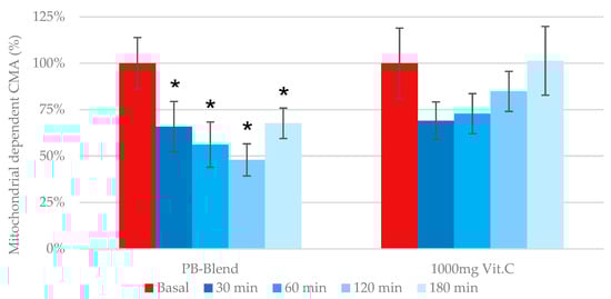 Time-dependent effects of a single dose of 50 mg of PB-Blend or 1000 mg of Vitamin C on eCMA-MITO values of subjects with a moderate course of COVID-19 infection. Results are presented as percent changes (deltas) from baseline. The eCMA-MITO was determined as the portion of the same human whole-blood sample after adding Antimycin A (10 µM), a selective complex III mitochondria respiration chain inhibitor. Study volunteers received a single oral dose of PB-Blend or Vitamin C 18–24 days after diagnosis of COVID-19. Data are shown as mean +/− standard error of the mean (SEM, n = 14 per group). Symbols *—p < 0.01, indicating statistical significance vs. baseline value prior to supplementation.