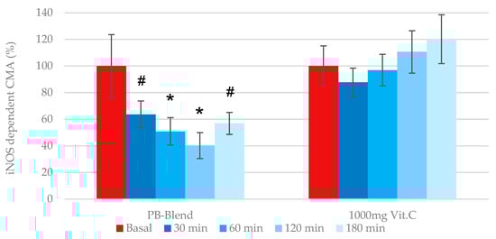 Single dose effects of 50 mg of PB-Blend or 1000 mg of Vitamin C on time-dependent eCMA-iNOS values of subjects having a moderate course of COVID-19 infection. The eCMA-iNOS was determined in the portion of the same human whole-blood sample after adding 1400 W (100 nM), a selective inhibitor of inducible nitric oxide synthase (iNOS). Data here represent the generation of ROS by dysfunctional or “uncoupled” iNOS, which is a consequence of excessive, cytokine-induced oxidative distress. Study volunteers received a single dose of PB-Blend or Vitamin C 18–24 days after diagnosis of COVID-19. Data are shown as mean +/− standard error of the mean (SEM, n = 14 per group). Symbols *—p < 0.01 or #—p < 0.05, indicating statistical significance vs. baseline value prior to supplementation.