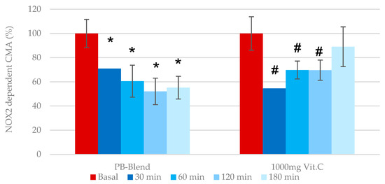 Time-dependent effects of a single dose of 50 mg of PB-Blend or 1000 mg of Vitamin C on phagocytic NADPH oxidase NOX2-CMA values of subjects after 18–24 days of a moderate course of COVID-19 infection. The NOX2-CMA was determined in a portion of the same human whole-blood sample after adding 10 µM Apocynin, a selective inhibitor of NOX2. NOX2-CMA values here represent the activation of NOX2 within inflammatory cells induced by COVID-19 infection. Data are shown as mean +/− standard error of the mean (SEM, n = 14 per group). Symbols *—p < 0.01 or #—p < 0.05, indicating statistical significance vs. baseline value prior to supplementation.