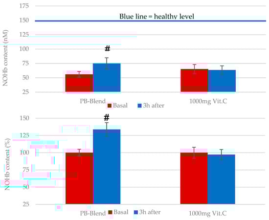 The single encapsulated oral administration of 50 mg of PB-Blend resulted in a significant elevation in circulating NOHb levels after 3 h of ingestion (Figure 5). Vitamin C had no statistically significant effect on the NOHb levels under these experimental conditions.