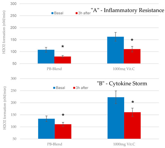 Single-dose effects of 50 mg of PB-Blend or 1000 mg of Vitamin C on time-dependent ex vivo TNFα-induced H2O2 formation rates in subjects with moderate course of COVID-19 infection. Panel (A): The TNFα level (40 ng/mL) is simulating the effects comparable to acute viral infection and described as “Inflammatory resistance”. Panel (B): Represents induction of H2O2 from blood cells after adding 200 ng/mL of TNFα, simulating a “Cytokine Storm” condition. Study volunteers received a single dose of PB-Blend or Vitamin C 18–24 days after diagnosis of COVID-19. Data are shown as mean +/− standard error of the mean (SEM, n = 14 per group). Symbol *—p < 0.01, indicating statistical significance vs. value before supplementation.