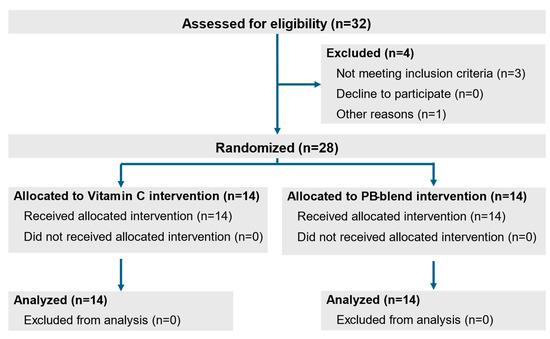 All subjects were enrolled 18–24 days after having tested positive for COVID-19 via PCR test. A “moderate COVID-19 disease course” was determined according to CDC criteria for a moderate disease course [50]. The assignment of volunteers into treatment groups was performed in a fully randomized manner. Neither the researchers nor the volunteers had any visibility or knowledge related to the group assignments or the respective identities of the test materials. After randomization, subjects were administered a single encapsulated dose of 50 mg of PB-Blend or a 1000 mg dose of Vitamin C as a positive control. Changes in the levels of bioavailable NO (measured as circulating NOHb) were assessed, as well as the ex vivo cellular formation of mitochondrial, NOX2-, iNOS-, and TNFα-dependent ROS. All parameters were measured in real time prior to ingestion (baseline), and then at 30, 60, 120, and 180 min after administration. All study volunteers were required to read and sign informed consent documentation. The study protocol was registered with and approved by the ethics committee of the Federal Medical Association of Baden-Württemberg (F-2021-033). The study was conducted according to the provisions of German law, ICH-GCP guidelines, and the general principles of the original World Medical Association’s Declaration of Helsinki.