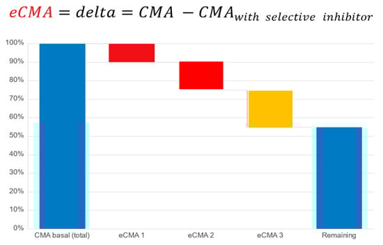 Principle of cellular metabolic activity and extended cellular metabolic activity assays designed to follow cellular physiology, health, and inflammatory marker changes. Illustrated schema represents an example distribution of oxidative stress-induced dysfunctional mitochondria (labeled as eCMA1), activated NOX2 of inflammatory cells (labeled as eCMA2), and dysfunctional (uncoupled) iNOS (labeled as eCMA3). Note that the total of the four bars on the right adds up to 100%.