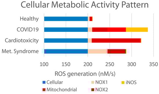 Effects of various health conditions on redox-dependent oxidative distress. According to each condition (healthy, viral insult, cardiotoxicity, and metabolic syndrome), enzymes such as NOX1, NOX2, iNOS, and enzymes of the mitochondria respiratory chain are involved in excessive but distinct generation of ROS, with each pattern representing the diagnostic “signature” of its respective pathology. Consequently, we examined the following various parameters to gain further insight into PB-Blend’s or Vitamin C’s potential capacities to support a healthier redox balance.