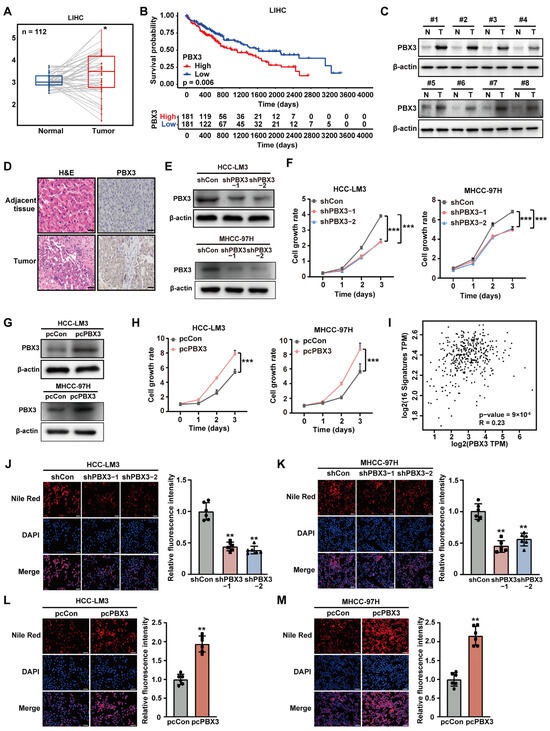PBX3 promotes HCC cell lipid accumulation. (A) PBX3 expression level clinical sample datasets obtained from TCGA database. (B) Kaplan–Meier survival plots for clinical HCC patients obtained from TCGA database with either low (blue; n = 181) or high (red; n = 181) PBX3 expression. (C) PBX3 protein expression level in clinical human HCC and adjacent tissues samples, as determined using western blotting. (D) Expression levels of PBX3 in clinical human HCC and adjacent tissues samples, as examined by immunohistochemistry staining (scale bars: 50 μm). (E) PBX3 protein expression levels in HCC-LM3 and MHCC-97H cells transfected with two shRNA expression vectors targeting different sites of PBX3, as examined using western blotting. (F) Cell proliferation rates of PBX3-knocked down HCC-LM3 and MHCC-97H cells. (G) PBX3 protein expression levels in HCC-LM3 and MHCC-97H cells transfected with pcPBX3. (H) Cell proliferation rates of PBX3-overexpressing HCC-LM3 and MHCC-97H cells. (I) Correlation analysis of the expression levels of PBX3 and lipid metabolism-related genes in clinical HCC samples obtained from TCGA data set. (J,K) Lipid droplet accumulation in PBX3-knocked down HCC-LM3 (J) and MHCC-97H (K) cells, as determined using Nile Red staining. Representative images ((left); scale bars: 200 μm) and quantification results ((right); n = 6) are shown. (L,M) Lipid droplet accumulation in PBX3-overexpressing HCC-LM3 (L) and MHCC-97H (M) cells, as determined using Nile Red staining. Representative images ((left); scale bars: 200 μm) and quantification results ((right); n = 6) are shown. Cells transfected with shCon or pcCon were used as controls. β-actin was used as western blotting loading control. Quantification data are expressed as mean ± SD (n = 3; unless otherwise indicated).