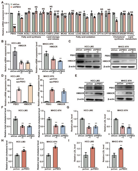 PBX3 promotes HCC cell cholesterol metabolism. (A) The mRNA expression levels of lipid metabolism-related genes in PBX3-knocked down HCC-LM3 cells, as determined using qRT–PCR. (B) HMGCR mRNA expression levels in PBX3-knocked down HCC-LM3 and MHCC-97H cells, as determined using qRT–PCR. (C) HMGCR protein expression levels in PBX3-knocked down HCC-LM3 and MHCC-97H cells, as determined using western blotting. (D) HMGCR mRNA expression levels in PBX3-overexpressing HCC-LM3 and MHCC-97H cells, as determined using qRT–PCR. (E) HMGCR protein expression levels in PBX3-overexpressing HCC-LM3 and MHCC-97H cells, as determined using western blotting. (F,G) Total cholesterol (F) and relative LDL (G) levels in PBX3-knocked down HCC-LM3 and MHCC-97H cells. (H,I) Relative total cholesterol (H) and LDL (I) levels in PBX3-overexpressing HCC-LM3 and MHCC-97H cells. Cells transfected with shCon or pcCon were used as controls. β-actin was used for qRT–PCR normalization and as western blotting loading control. Total protein was used for normalization of total cholesterol and LDL levels. Quantification data are expressed as mean ± SD (n = 3).