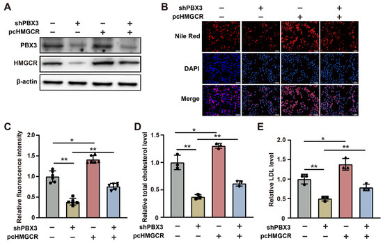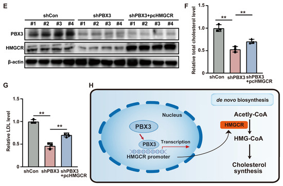 Next, to elucidate whether PBX3 regulation of HMGCR is involved in its role as a positive regulator of cholesterol metabolism, we constructed an HMGCR overexpression vector (Figure S3) and overexpressed HMGCR in PBX3-knocked down HCC-LM3 cells (Figure 3A). Overexpression of HMGCR partially restored the lipid droplet accumulation suppressed by PBX3 knockdown (Figure 3B,C). Similarly, HMGCR overexpression partially cancelled the effect of PBX3 knockdown in suppressing total cholesterol and LDL levels (Figure 3D,E). Together, these results showed that PBX3 is a positive regulator of the HMGCR/mevalonate pathway, which in turn promotes cholesterol metabolism in HCC cells.