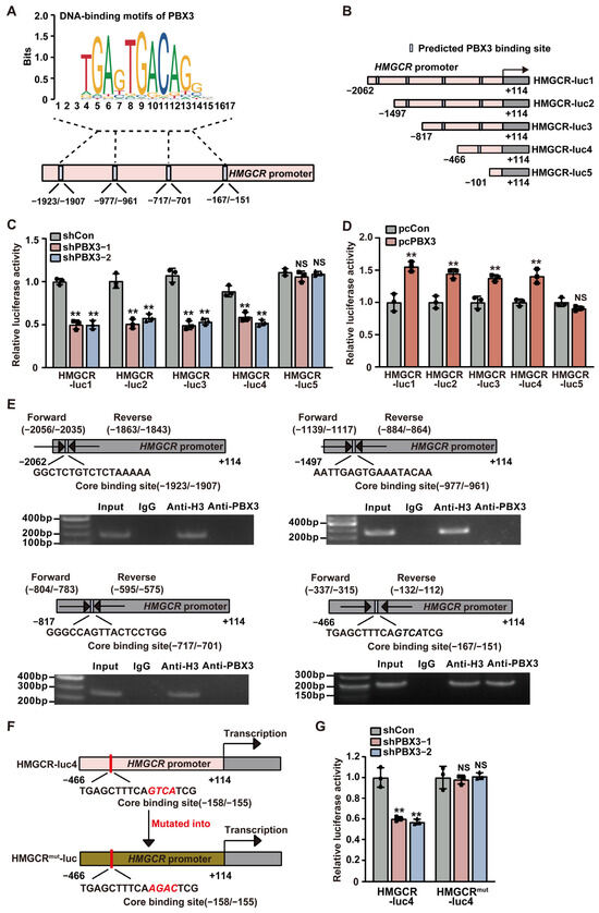 To further explore the molecular mechanism by which PBX3 regulates HMGCR, we next investigated the possibility of PBX3 binding to the HMGCR promoter. Prediction using a JASPAR database ((http://jaspar.genereg.net; accessed on 11 August 2023) revealed four possible PBX3 binding sequences in the −1923 to −1907, −977 to −961, −717 to −701, and −167 to −151 regions of the HMGCR promoter (Figure 4A). Accordingly, we constructed five luciferase reporter vectors carrying different regions of the HMGCR promoter: HMGCR-luc-1, which contained the −2062 to +114 region; HMGCR-luc-2, which contained the −1497 to +114 region; HMGCR-luc-3, which contained the −817 to +114 region; HMGCR-luc-4, which contained the −466 to +114 region; and HMGCR-luc-5, which contained the −101 to +114 region (Figure 4B). Luciferase assays revealed that knocking down PBX3 significantly suppressed the activities of HMGCR-luc-1, HMGCR-luc-2, HMGCR-luc-3, and HMGCR-luc-4, but not that of HMGCR-luc-5 (Figure 4C). Concomitantly, PBX3 overexpression significantly promoted HMGCR-luc-1, HMGCR-luc-2, HMGCR-luc-3 and HMGCR-luc-4 activities, while this did not significantly affect that of HMGCR-luc-5 (Figure 4D). Together, these results suggest that the −466 to −102 region of the HMGCR promoter is crucial for its transcriptional regulation by PBX3.