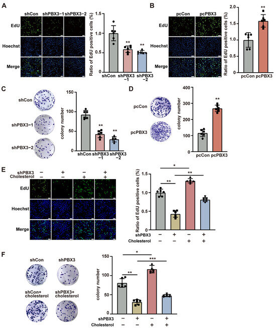 Cholesterol is critical for PBX3-induced HCC cell proliferation and colony formation. (A,B) Proliferation potential of PBX3-knocked down (A) and PBX3-overexpressing (B) HCC-LM3 cells, as determined using EdU-incorporation assay. Representative images ((left); scale bars: 100 μm) and quantification results ((right); n = 6) are shown. (C,D) Colony formation potential of PBX3-knocked down (C) and PBX3-overexpressing (D) HCC-LM3 cells. Representative images (left) and quantification results ((right); n = 6) are shown. (E) Proliferation potential of PBX3-knocked down HCC-LM3 cells treated with cholesterol (final concentration: 10 μg/mL), as determined using EdU-incorporation assay. Representative images ((left); scale bars: 100 μm) and quantification results ((right); n = 6) are shown. (F) Colony formation potential of PBX3-knocked down HCC-LM3 cells treated with cholesterol (final concentration: 10 μg/mL). Representative images (left) and quantification results ((right); n = 6) are shown. Cells transfected with shCon or pcCon were used as controls. Quantification data are expressed as mean ± SD.