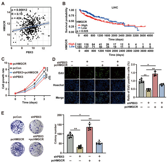 HMGCR is critical for PBX3-induced HCC cell proliferation potential. (A) Correlation analysis between PBX3 and HMGCR expression levels in HCC samples using TCGA data set. (B) Kaplan-Meier survival plots of clinical HCC patients with either low (blue; n = 184) or high (red; n = 182) PBX3 expression. (C) Cell growth rate of PBX3-knocked down, HMGCR-overexpressing HCC-LM3 cells. (D) Proliferation potential of PPBX3-knocked down, HMGCR-overexpressing HCC-LM3 cells, as determined using EdU-incorporation assay. Representative images ((left); scale bars: 100 μm) and quantification results ((right); n = 6) are shown. (E) Colony formation potentials of PPBX3-knocked down, HMGCR-overexpressing HCC-LM3 cells, Representative images (left) and quantification results ((right); n = 6) are shown. Cells transfected with shCon and/or pcCon were used as controls. Quantification data are expressed as mean ± SD (n = 3; unless otherwise indicated).