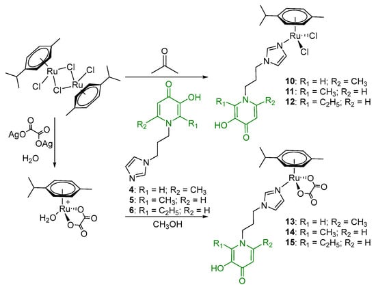 - Hackl, C.M.; Legina, M.S.; Pichler, V.; Schmidlehner, M.; Roller, A.; Dömötör, O.; Enyedy, E.A.; Jakupec, M.A.; Kandioller, W.; Keppler, B.K. Thiomaltol-Based Organometallic Complexes with 1-Methylimidazole as Leaving Group: Synthesis, Stability, and Biological Behavior. Chem. Eur. J. 2016, 22, 17269–17281. [Google Scholar] [CrossRef]