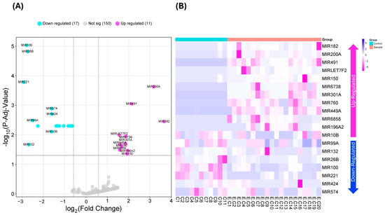 Differentially expressed miRNAs in endometrial cancer. (A) Volcano plot showing the distribution of differentially expressed miRNAs. The normalized adjusted p-value is represented as the negative base-10 logarithm (−log10 P-Adj-Value), while the normalized fold change is expressed as the base-2 logarithm (log2 Fold Change). miRNAs were filtered based on a P-Adj-Value < 0.05. Overexpressed miRNAs are shown in fuchsia, while underexpressed genes are shown in light blue. (B) Heatmap illustrating the fold change in the 19 differentially expressed miRNAs (DEMs) identified in endometrial cancer samples. DEMs were selected based on a fold change ≥ 1.5 and a P-Adj-Value ≤ 0.05. C1–11: Non-cancerous endometrial samples (light blue bar, top left). EC1–20: Endometrial cancer samples (pink bar, top right).