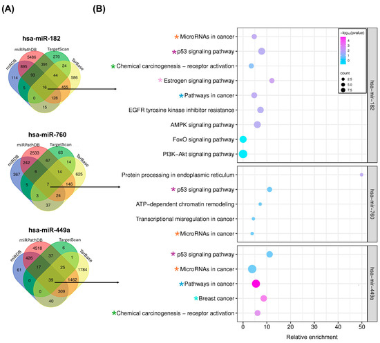 Targets of miRNAs and enrichment analysis. (A) Venn diagrams illustrating the overlap of target genes for hsa-miR-182, hsa-miR-760, and hsa-miR-449a. The arrow indicates the number of common target genes identified in the miRDB, miRPathDB, TargetScan, and TarBase databases. (B) Signaling pathways significantly enriched with miRNA target genes. The color scale represents the relative enrichment, while the size of the circles indicates the number of enriched genes in each pathway. The x-axis of the graph represents the enrichment score for each gene set, ranging from 0 to 10. The asterisks indicate signaling pathways shared by the three miRNAs.