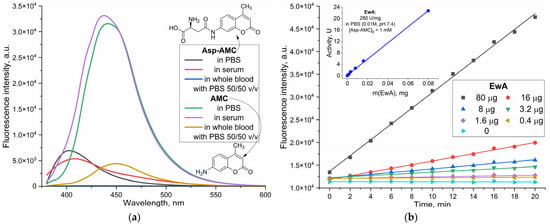 (a) Fluorescence emission spectra of 5 µM AMC and Asp-AMC fluorescent product and substrate for L-ASNase in PBS buffer, bovine blood serum, and whole blood diluted with PBS (50/50 v/v). λexci = 360 nm. pH = 7.4. T = 37 °C. (b) Example of kinetic curves of Asp-AMC hydrolysis (1 mM) under the action of L-ASNase in PBS (pH 7.4, 0.01 M). λexci = 360 nm. λemi = 460 nm. T = 37 °C. The insert shows the linear dependence of the observed activity on the amount of the enzyme.