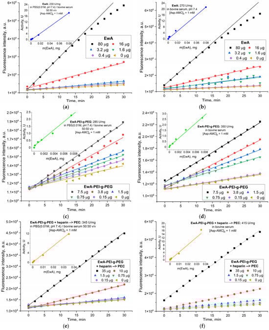 Kinetic curves of Asp-AMC hydrolysis (1 mM) under the action of L-ASNases: (a) EwA in 50% (v/v) bovine serum mixed with PBS; (a) EwA in 50% (v/v) bovine serum mixed with PBS; (b) EwA in 100% bovine serum; (c) EwA-PEI-g-PEG in 50% (v/v) bovine serum mixed with PBS; (d) EwA-PEI-g-PEG bovine serum; (e) EwA-PEI-g-PEG + heparin PEC in 50% (v/v) bovine serum mixed with PBS; and (f) EwA-PEI-g-PEG + heparin PEC in bovine serum. λexci = 360 nm. λemi = 460 nm. pH = 7.4. T = 37 °C. The insert shows the linear dependence of the observed activity on the amount of the enzyme.