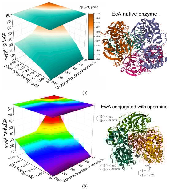 Figure 3 presents three-dimensional graphs illustrating the relationship between the enzymatic hydrolysis rate, enzyme concentration, and serum volume fraction for Asp-AMC hydrolysis catalyzed by (a) native EcA, used here as a commercially available control; (b) spermine-conjugated EwA (EwA-sp); and (c) PEI-g-PEG-conjugated RrA. To investigate the influence of enzyme properties, such as molecular mass (MM) and isoelectric point (pI), on serum interactions and assay performance, we expanded our analysis to include additional L-asparaginases. Specifically, we chose enzymes with contrasting characteristics: RrA (tetrameric Mw of approximately 18 × 4 = 72 kDa and pI of 5.0–5.2) and EwA (tetrameric Mw of approximately 34 × 4 = 136 kDa and pI of 7.5–8.0). This comparison allows us to assess how these properties affect the 3D diagram of serum influence (Table 1 and Table 2) and, ultimately, the accuracy of activity measurements in a complex biological matrix. These graphs were generated to determine the optimal composition of a buffer/serum system for analysis. Native EcA serves as a reference sample due to its widespread use and established activity profile. This approach enables optimization of the assay conditions for each enzyme variant, ensuring accurate and reliable activity measurements in a biologically relevant context.