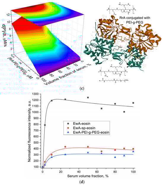 Three-dimensional graphs of the relationship between the rate of enzymatic hydrolysis of Asp-AMC by (a) the native EcA enzyme, (b) EwA conjugated with spermine, and (c) RrA conjugated with PEI-g-PEG for determining the optimal composition of the analyzed buffer/serum system. C0(Asp-AMC) = 1 mM. λexci = 360 nm. λemi = 460 nm. pH = 7.4. T = 37 °C. (d) Dependence of the fluorescence intensity of eosin covalently attached to asparaginase for the formation of native EwA, EwA-sp conjugate, and EwA-PEI-g-PEG conjugate on the volume fraction of blood serum. C(L-ASNase) = 0.1 mg/mL. λexci = 515 nm. λemi = 550 nm. pH = 7.4. T = 37 °C.