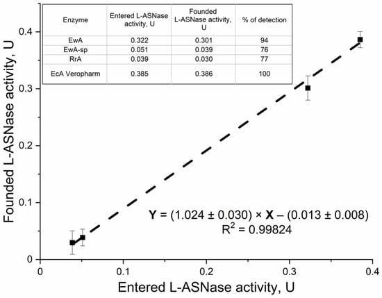 Figure 4 presents a validation of the L-ASNase activity assay, using various L-ASNase samples (EwA, EwA-sp, RrA, and EcA Veropharm). This diverse set of samples allowed us to assess the influence of the source organism and polymer conjugation on the assay’s performance. Our objective was to evaluate the assay’s accuracy and reliability across different enzyme formulations and dilutions, particularly in the presence of serum, given its potential impact on activity measurements. Using the calibration established in Figure 1 (for both buffer and serum), we determined the activities of these samples in varying serum concentrations and compared them to their expected activities (based on mg of enzyme) determined by CD spectroscopy. The data demonstrate good agreement between the entered (expected) and founded (measured) enzyme activities, supporting the reliability and accuracy of the developed methodology. Specifically, the percentage of detection, reflecting the ratio of founded to entered activity, ranges from 75.9% to 100.4%, indicating efficient detection of the enzyme activity across different L-ASNase types. The EcA Veropharm sample displays complete recovery (100.4%), suggesting optimal assay performance for this particular enzyme. While demonstrating good overall recovery, the EwA-sp and RrA samples exhibit slightly lower detection percentages (75.9% and 77.1%, respectively)—because when low concentrations of asparaginase drugs are administered, a reduced % of the determination is observed.
