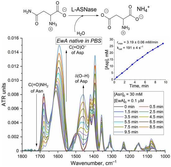 Figure 5 presents the FTIR spectra of Asn at 30 mM concentration during the process of catalytic hydrolysis by EwA. The observed spectral changes during asparagine hydrolysis (decrease at 1680 cm−1 and increases at 1460 cm−1, 1590 cm−1, and 1400 cm−1) reflect the conversion of Asn to Asp. The 1680 cm−1 band corresponds to the amide C=O stretch in Asn, which diminishes as the amide bond is hydrolyzed. The increases at 1460 cm−1, 1590 cm−1, and 1400 cm−1 represent emerging carboxylate (COO⁻) oscillations in the aspartate product. To construct kinetic curves, we used a band 1680 cm−1 corresponding to C(=O)NH2 of Asn (Supplementary Figure S4). By tracking the decrease in this band’s intensity, we converted the calibration curves ATR units into concentration units. Then, we constructed the Asp product accumulation (Figure 5 insert) curves. By analyzing the tangent of the angle of inclination in the initial section, we determined Vmax and subsequently calculated kcat (Figure 6a,b).