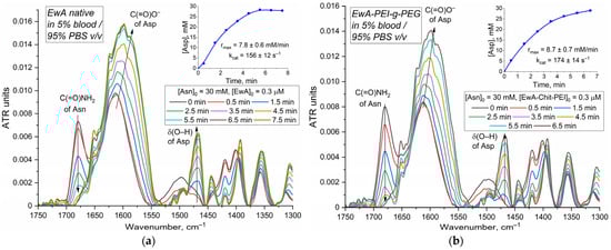 Figure 6a,b illustrate L-asparagine hydrolysis by native and EwA-PEI-g-PEG, respectively. The kinetic inserts reveal comparable hydrolysis rates for both forms, corroborating the findings from the three-dimensional activity profiles (Figure 4) and suggesting a moderate (~10%) improvement in activity in blood upon PEI-PEG modification.