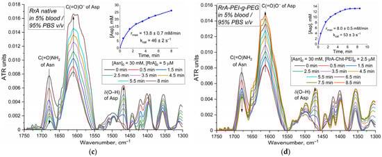 FTIR spectra of asparagine (30 mM) during catalytic hydrolysis by (a) EwA (300 nM) and (b) EwA conjugated with PEI-PEG (300 nM) in 5% blood (+95% PBS v/v). The insert shows the kinetic curve of hydrolysis. FTIR spectra of asparagine (30 mM) during catalytic hydrolysis by (c) RrA (5 µM) and (d) RrA conjugated with PEI-PEG (2.5 µM) in 5% blood (+95% PBS v/v). The insert shows the kinetic curve of hydrolysis. The contribution of blood cells is taken into account as the background (Supplementary Figure S5). PBS (0.01 M, pH 7.4). T = 37 °C.