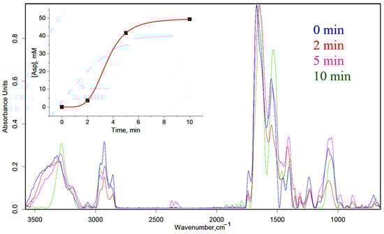 FTIR spectra of asparagine (30 mM) during catalytic hydrolysis by EwA (100 nM). The insert shows the kinetic curve of hydrolysis. Sodium-phosphate buffer (0.1 M, pH 7.4). T = 37 °C.