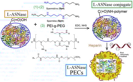 Furthermore, conjugates of L-ASNase with a variety of carriers, designed to enhance the pharmacokinetic characteristics and mitigate the immunogenicity of the enzyme, are of significant interest. These carriers encompass natural polycations such as oligoamines, including spermine and spermidine, as well as derivatives of cationic polymers, like chitosan, polyethyleneimine (PEI), PEG–chitosan, PEI-g-PEG, etc. [,,,]. The conjugation of L-ASNase with these copolymers can result in an extension of the enzyme’s circulation time in the bloodstream, an enhancement of its accumulation in tumor tissue, and a reduction in the body’s response to the presence of an alien protein.