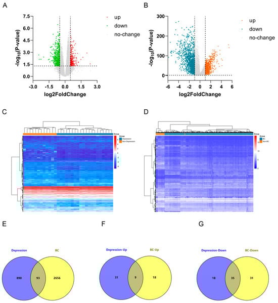 2.1. Identification of Differentially Expressed Genes (DEGs) in Depression and Breast Cancer (BC)