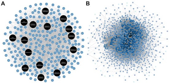 A total of 16 methoxyflavones in KP were obtained through literature searches [,,], and the relevant ADME information is presented in Table 1. All methoxyflavones met the criteria with Lipinski’s Rules of Five (molecular weight < 500 g/mol, HBA < 10, HBD < 5, MlogP < 4.15, and TPSA (Å2) < 140). Furthermore, these compounds demonstrated a high bioavailability score (>0.1) and no Lipinski violations. Predicting potential pharmacological adverse effects is a crucial step in the drug development process. Thus, the ADMETlab 2.0 software was used for evaluating the toxicological parameters of these compounds, such as carcinogenicity, mutagenicity, hepatotoxicity, and rat oral acute toxicity. All the methoxyflavones have no carcinogenicity, hepatotoxicity, or rat oral acute toxicity. However, only 5,7-dimethoxyflavone had medium mutagenicity (Table S1). According to the target prediction systems in SwissTargetPrediction, STITCH, and TargetNet, we found 232 genes that could be the target of the 16 methoxyflavones (Table S2). The KP component–target network was constructed by Cytoscape 3.10.1 software, including 249 nodes and 2207 edges. The black circular node represents the active compounds, and the blue circular node represents the target genes (Figure 1A). Among them, topological analysis by a network analyzer showed that the top five active compounds in this network are 5,7,4′-trimethoxyflavone (degree = 157), 3,5,7,3′,4′-pentamethoxyflavone (degree = 156), 5-hydroxy-7,3′,4′-trimethoxyflavone (degree = 155), 5-hydroxy-3,7,4′-trimethoxyflavone (degree = 154), and 5-hydroxy-7-methoxyflavone (degree = 152). This finding suggests that the main bioactive compounds in KP were essential to the treatment of related disorders through a synergistic action.