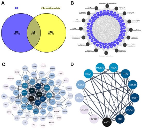 Compound targets the network and protein–protein interaction network. (A) Venn diagram showing the intersection targets of KP targets and psoriasis-related chemokine genes. (B) Compound targets network. The circular black node represents the KP bioactive compounds, and light blue represents the target genes. (C) Core target genes of chemokine signaling pathways. (D) Black nodes represent the higher degree. Color saturation of the edges represents the confidence score of a functional association.