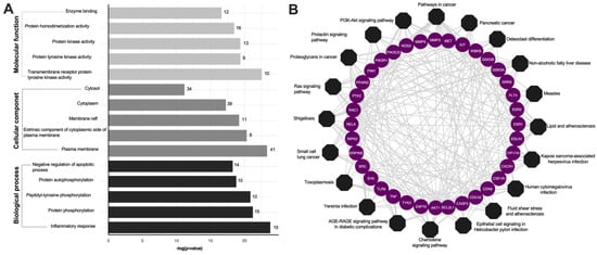 Enrichment analysis of the KP targets. (A) Bar plot GO enrichment analysis. The top five significantly enriched GO (−log10 (p-value)) terms of the target genes in the molecular function (light gray), cellular component (dark gray), and biological processes (black). (B) KP compounds target pathway networks. The circular purple nodes represent the related targets, and the black nodes represent the top twenty pathways.
