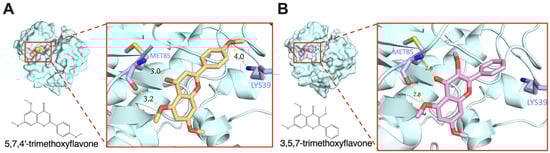 Molecular docking of molecule structures and binding sites between SRC and selected compounds: (A) 5,7,4′-trimethoxyflavone and (B) 3,5,7-trimethoxyflavone.