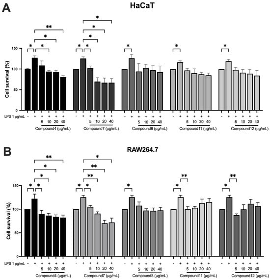 Effects of bioactive compounds in KP on cell proliferation in HaCaT and RAW264.7 cells under inflammatory conditions. (A) HaCaT keratinocytes and (B) RAW264.7 macrophages were treated with LPS (1 μg/mL) to induce an inflammatory response, followed by exposure to different concentrations (0, 5, 10, 20, and 40 μg/mL) of each compound for 48 h. Data are presented as mean ± S.D. from at least three independent experiments. Statistical significance was determined using one-way ANOVA followed by post hoc analysis (* p < 0.05 and ** p < 0.01). Compound 4: 5,7,4′-trimethoxyflavone; compound 7: 3,5,7-trimethoxyflavone; compound 8: 5-hydroxy-3,7,4′-trimethoxyflavone; compound 11: 5-hydroxy-3,3′,4′,7-tetramethoxyflavone; and compound 12: 3,5,7,3′,4′-pentamethoxyflavone.