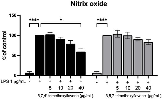 Effects of 5,7,4′-trimethoxyflavone and 3,5,7-trimethoxyflavone on nitric oxide production in LPS-induced RAW264.7 cells. RAW264.7 cells were co-treated with LPS (1 µg/mL) with either 5,7,4′-trimethoxyflavone (left) or 3,5,7-trimethoxyflavone (right) of KP (5, 10, 20, and 40 µg/mL) for 24 h, and nitrite concentrations were measured using the Griess reaction. Data are presented as mean ± S.D. of three independent experiments. Statistical significance was determined using one-way ANOVA followed by post hoc analysis (* p < 0.05 and **** p < 0.0001).
