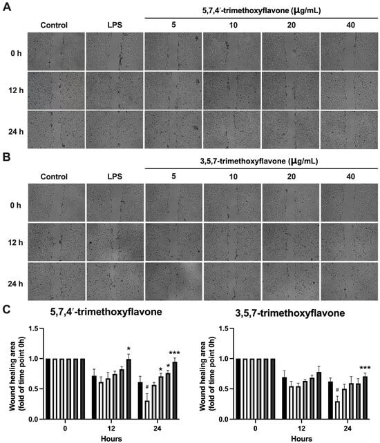 Effects of 5,7,4′-trimethoxyflavone and 3,5,7-trimethoxyflavone on HaCaT Cell Migration. (A) Microscopic pictures of HaCaT cell migration assay and (B) graphical analysis of the effect of 5,7,4′-trimethoxyflavone and 3,5,7-trimethoxyflavone on keratinocyte migration (the percentage of gap-filled). The cells treated with 15 μg/mL of 5,7,4′-trimethoxyflavone and 3,5,7-trimethoxyflavone were compared with the untreated cells and DMSO-treated cells. (C) Quantification of the wound healing area of both compounds. Data are presented as mean ± S.D. of three independent experiments. Statistical significance was determined using one-way ANOVA followed by post hoc analysis (* p < 0.05 and *** p < 0.001 vs. control and # p < 0.05 vs. LPS group).