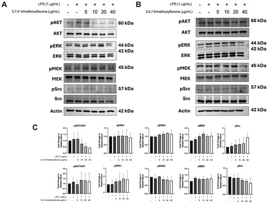 Effects of 5,7,4′-trimethoxyflavone and 3,5,7-trimethoxyflavone on the phosphorylation of key signaling proteins in LPS-induced HaCaT cells. (A) Western blot analysis of pAKT, AKT, pERK, ERK, pMEK, MEK, pSRC, and SRC in LPS-stimulated cells treated with different concentrations (5, 10, 20, and 40 μg/mL) of 5,7,4′-trimethoxyflavone. (B) Western blot analysis of the same proteins in LPS-stimulated HaCaT cells treated with 3,5,7-trimethoxyflavone at varying concentrations. (C) Quantification of the fold change in pAKT/AKT, pERK1, pERK2, pMEK, and pSRC relative to control groups. Data are presented as mean ± S.D. of three independent experiments.