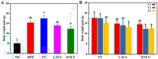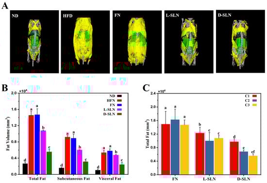 - Group 9–11 (freshly dispersed fucoxanthin-loaded solid lipid nanoparticles: D-SLNs): Fed HFD and gavaged with D-SLNs at low (33.33 mg/kg), medium (66.67 mg/kg), and high (100 mg/kg) doses.