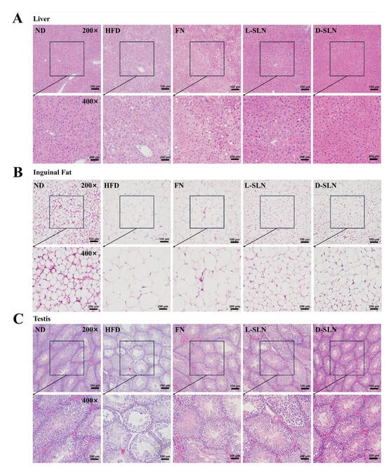 - Group 6–8 (lyophilized fucoxanthin-loaded solid lipid nanoparticles: L-SLNs): Fed HFD and gavaged with L-SLNs at low (33.33 mg/kg), medium (66.67 mg/kg), and high (100 mg/kg) doses.
